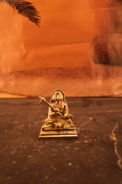 This image represents a finely crafted Adi Shankaracharya brass idol, depicting the revered Indian philosopher and spiritual teacher seated in a traditional posture, holding a staff (danda). The idol reflects classical Indian artistry and spiritual symbolism, designed for worship, décor, or gifting purposes.