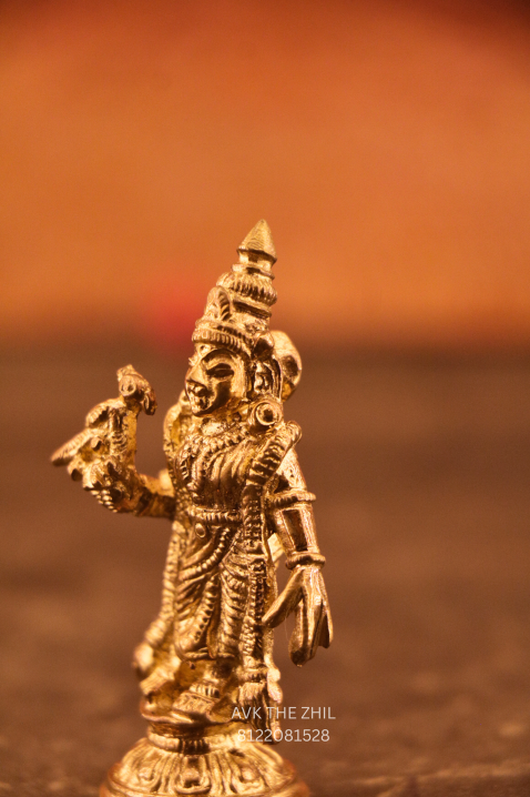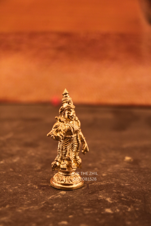 A beautifully crafted Andal Devi miniature idol, made with fine detailing and a polished brass finish. The idol represents Andal in a graceful standing posture, symbolizing devotion and divine love. Its compact size makes it ideal for home altars, pooja rooms, office desks, and gift purposes.