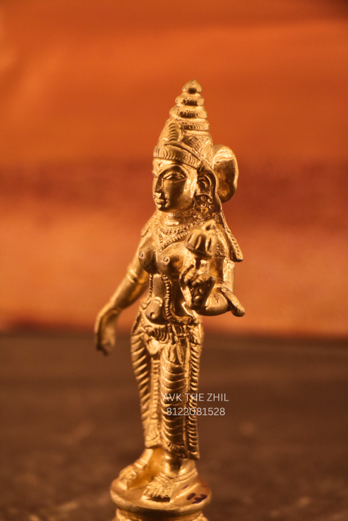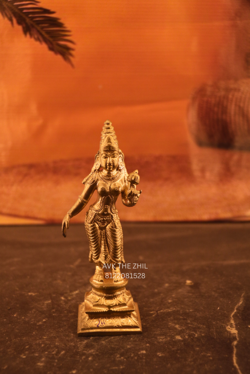 This image shows a handcrafted brass Ambal (Goddess) idol, traditionally made for worship and spiritual décor. The idol represents divine grace and protection and is suitable for home temples, pooja rooms, and gifting purposes.