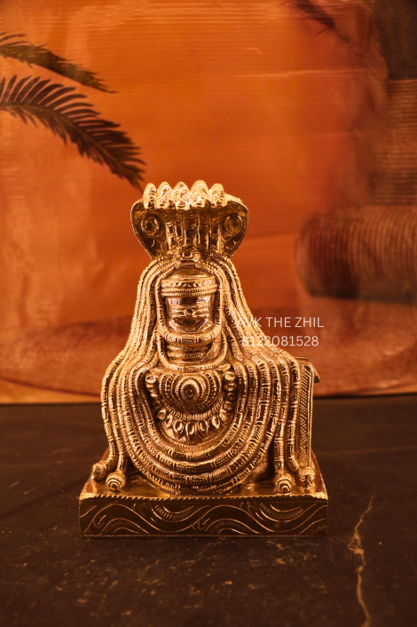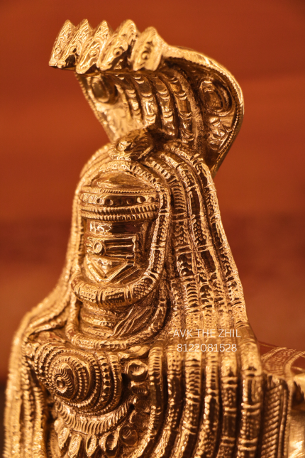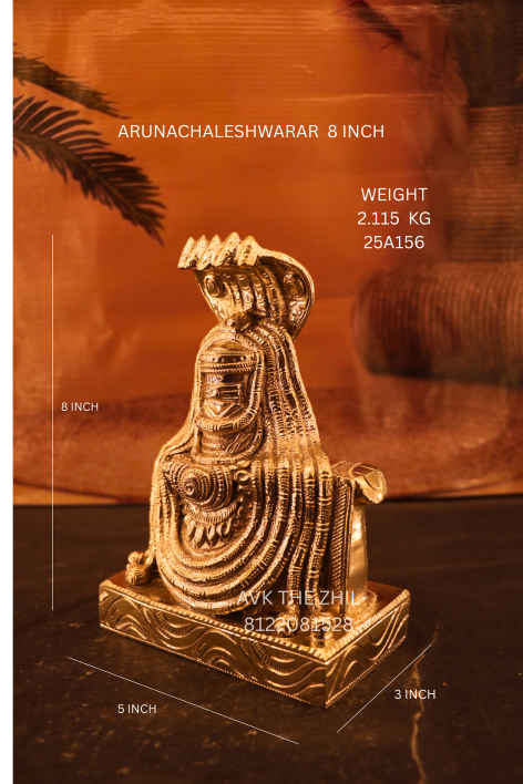 This image features a beautifully crafted Arunachaleswarar idol (8-inch), made with fine metallic detailing and traditional South Indian sculptural artistry. The deity is shown in a powerful yet serene posture, adorned with sacred ornaments and a protective multi-hooded serpent (Naga), representing spiritual awakening and divine protection.