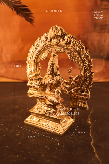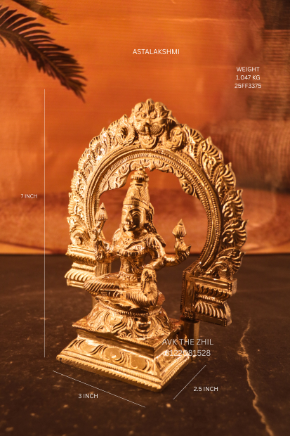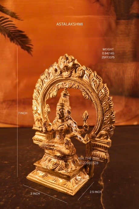 Ashtalakshmi symbolizes the eight kinds of prosperity bestowed by Goddess Lakshmi. These include Adi Lakshmi (primeval wealth), Dhana Lakshmi (financial wealth), Dhanya Lakshmi (abundance of food), Gaja Lakshmi (royalty and power), Santana Lakshmi (children and family prosperity), Veera Lakshmi (courage and strength), Vijaya Lakshmi (success and victory), and Vidya Lakshmi (knowledge and wisdom). Together, the Ashtalakshmi forms represent material, spiritual, and moral prosperity, guiding devotees toward a harmonious and prosperous life.