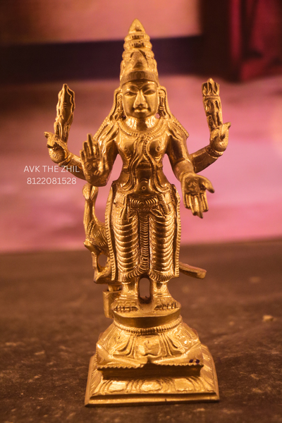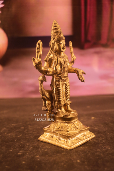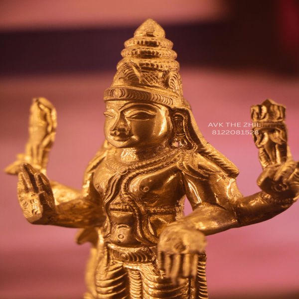 This Bala Murugan 6-inch brass statue is a beautifully crafted idol representing Lord Murugan in his youthful form. Made from high-quality solid brass, the statue features intricate detailing in the crown, ornaments, and attire, reflecting traditional South Indian craftsmanship. Standing on a decorative pedestal, the idol radiates spiritual grace and is ideal for daily pooja, shelves, altars, and gift purposes.