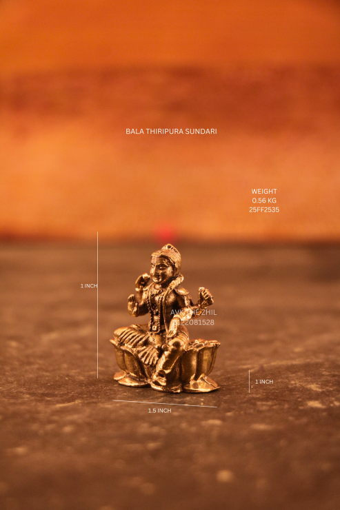 A beautifully detailed Bala Tripura Sundari idol, symbolizing purity, wisdom, and divine energy. Crafted in solid brass with a traditional antique finish, the idol showcases exquisite workmanship and balanced proportions. Its small size makes it perfect for personal altars, travel pooja kits, or gifting purposes. The warm golden tone enhances its spiritual presence and aesthetic appeal.