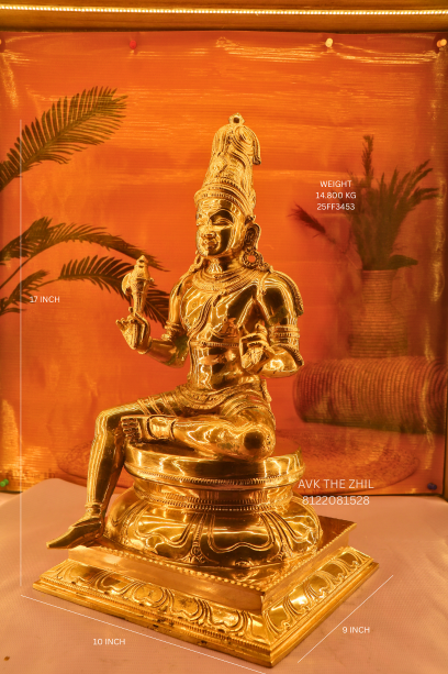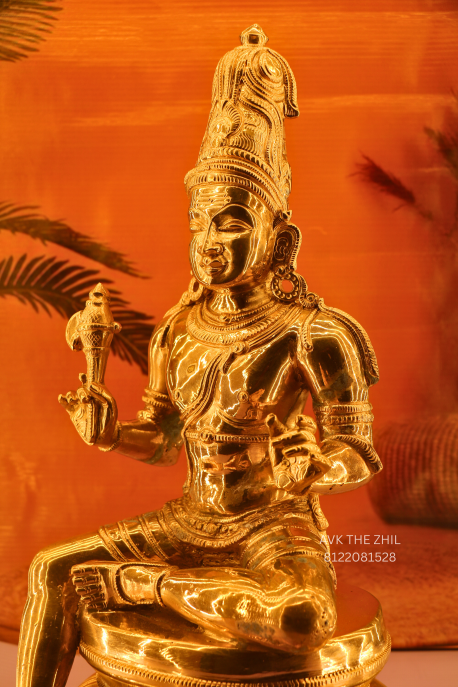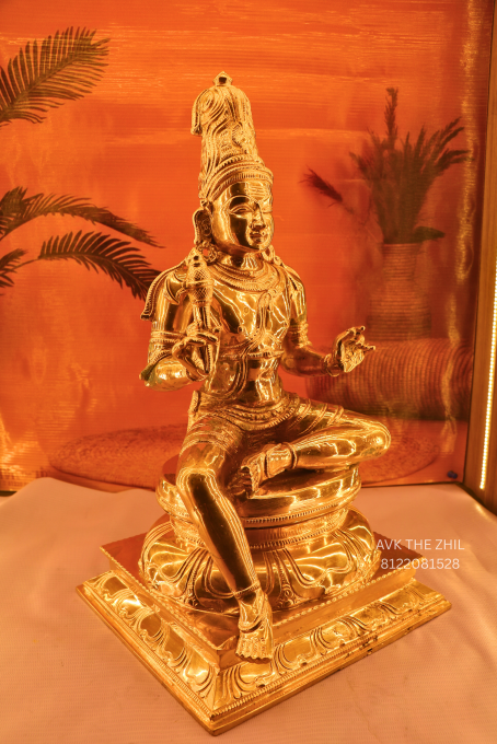 This image features a finely detailed golden devotional statue placed against a warm orange background. The deity is seated gracefully on a decorative base with intricate carvings. The statue has a radiant gold finish that reflects light beautifully, enhancing its divine appearance.