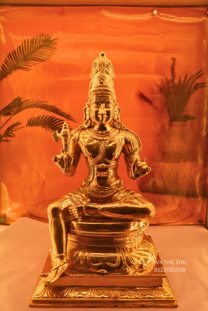 The idol appears to hold symbolic objects in its hands and wears an elaborate crown and traditional ornaments, representing spiritual power and blessings. The smooth polished surface and rich detailing highlight expert craftsmanship.