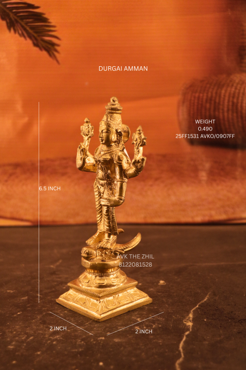 Durga Amman Brass Idol – A finely crafted brass statue depicting Goddess Durga Amman standing gracefully on a square pedestal, symbolizing strength, protection, and divine power. Ideal for home pooja, temples, and spiritual décor.