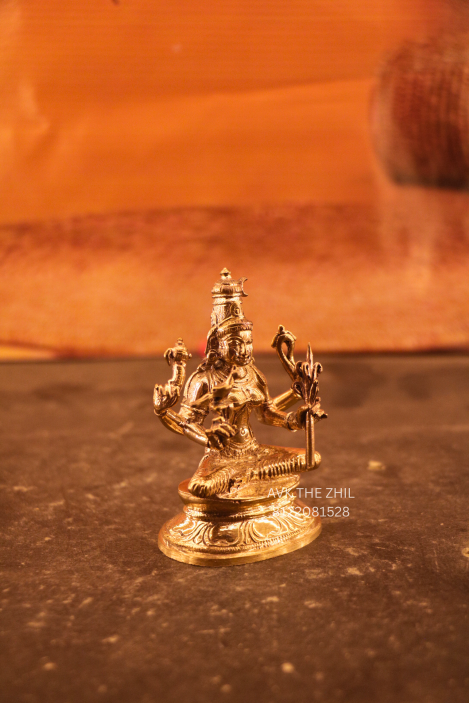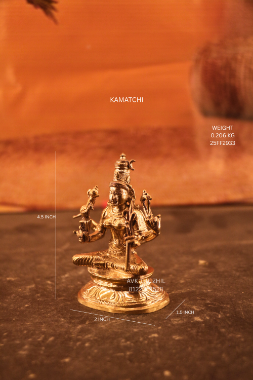 This image shows a finely crafted Kamatchi (Goddess Kamakshi) brass idol, designed with traditional South Indian iconography. The idol is compact, well-balanced, and suitable for home pooja, temple use, or decorative spiritual spaces.