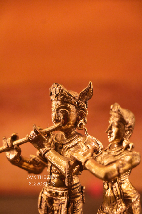 A finely crafted brass statue depicting Lord Krishna with Radha, captured in a graceful pose where Krishna plays the flute and Radha stands beside him in divine harmony. This idol symbolizes eternal love, devotion, and spiritual bliss, making it ideal for pooja rooms, home décor, and gifting purposes.
