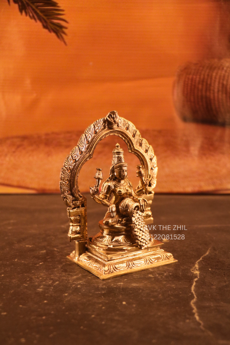 A finely crafted brass Lakshmi idol depicting Goddess Lakshmi seated gracefully under an ornate arch, symbolizing wealth, prosperity, and divine blessings. This traditional sculpture is ideal for home pooja rooms, offices, and spiritual décor.