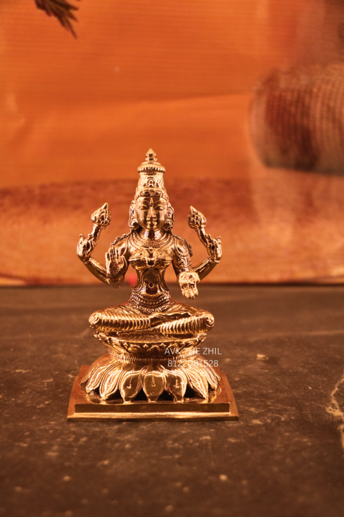 This elegant brass Lakshmi idol showcases Goddess Lakshmi in a traditional seated posture on a beautifully sculpted lotus base. The idol features intricate detailing on the crown, ornaments, and facial expressions, reflecting skilled craftsmanship. Its compact size makes it perfect for home temples, office desks, pooja rooms, or festive decorations.