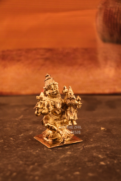 A finely crafted Lakshmi Narasimhar idol, made with detailed workmanship, representing the divine form of Lord Narasimha with Goddess Lakshmi, symbolizing protection, prosperity, and spiritual strength.