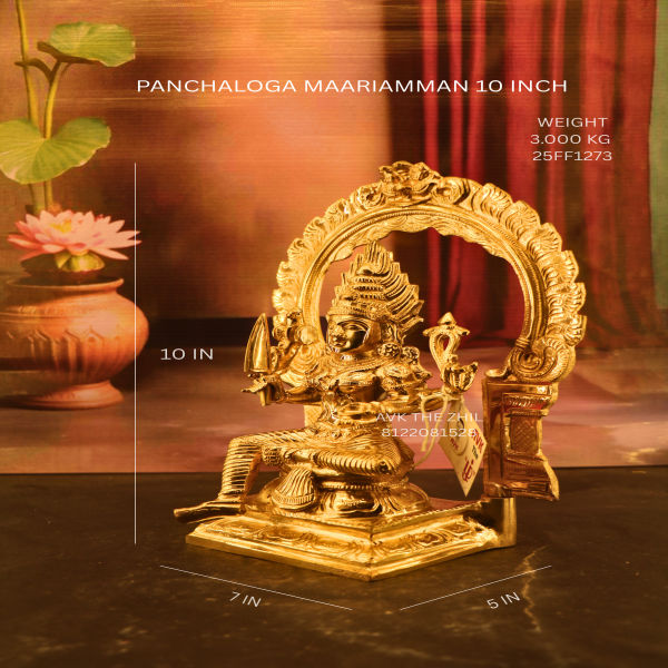 Maariamman (also spelled Mariamman or Mariyamman) is a Hindu goddess primarily worshiped in South India. She is considered the goddess of rain, fertility, and health, particularly known for her power to cure diseases such as smallpox and other contagious ailments. Maariamman is often depicted with a fierce yet benevolent demeanor, symbolizing protection and nurturing. She is highly revered in rural communities, and her festivals involve vibrant rituals, prayers, and offerings seeking her blessings for good health and prosperity. The Panchaloga term refers to the statue being made from an alloy of five metals, a traditional method believed to enhance the spiritual potency of idols.