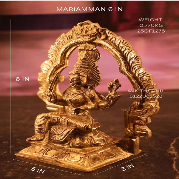 This is a 6-inch brass statue of Goddess Mariamman, the powerful South Indian deity known for protection, health, and prosperity. Mariamman is worshipped as the Goddess of Rain, Fertility, and Healing, especially revered for curing illnesses and bringing wellbeing to households.