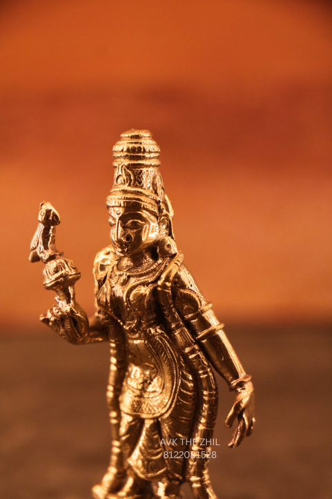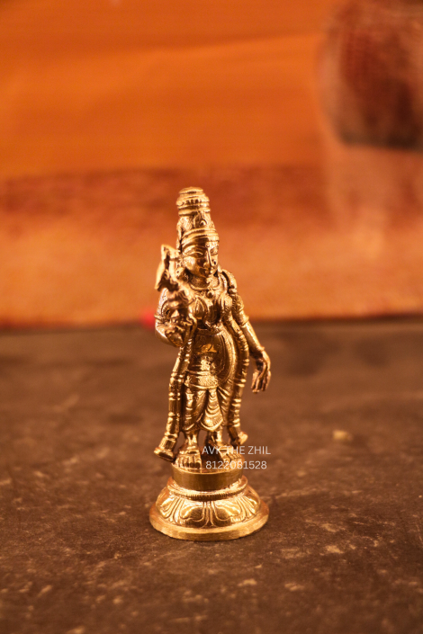 This image shows a finely crafted Meenakshi Amman brass idol, designed with traditional South Indian temple artistry. The idol is compact in size, detailed in ornamentation, and suitable for home pooja, gifting, or decorative spiritual use.