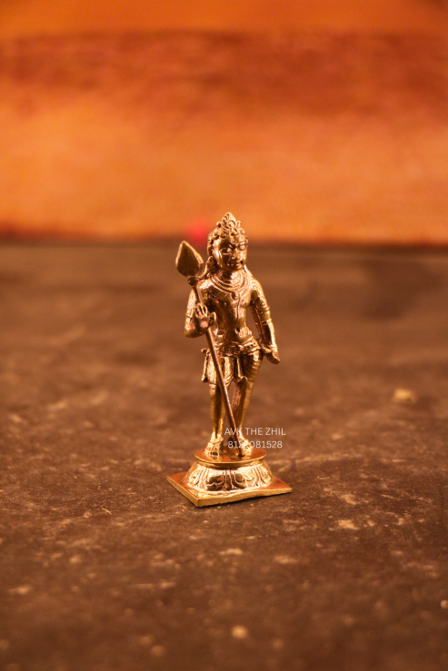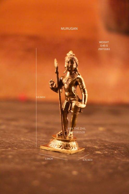 This elegant Lord Murugan (Murugan Swamy) idol is a beautifully detailed miniature sculpture standing 3.5 inches tall. The idol depicts Lord Murugan holding the Vel (spear), symbolizing wisdom, courage, and divine protection.