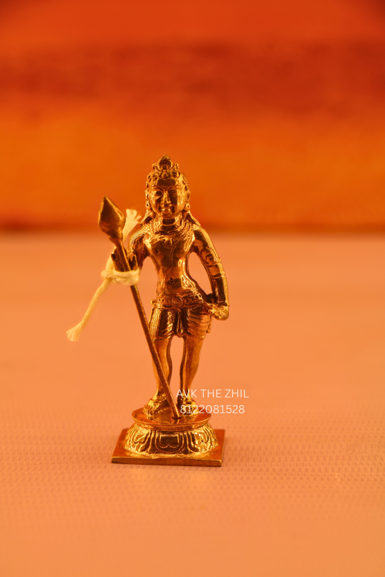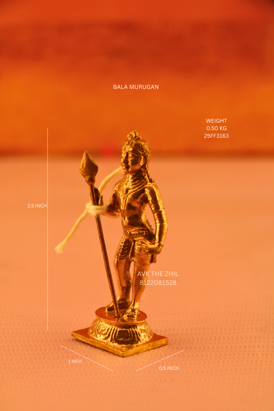 The image features a beautifully detailed Bala Murugan statue placed against a warm studio-style background that enhances its golden shine. The idol stands at approximately 2.5 inches in height with a compact, sturdy base, making it ideal for home altars, pooja rooms, workspaces, or as a spiritual gift.