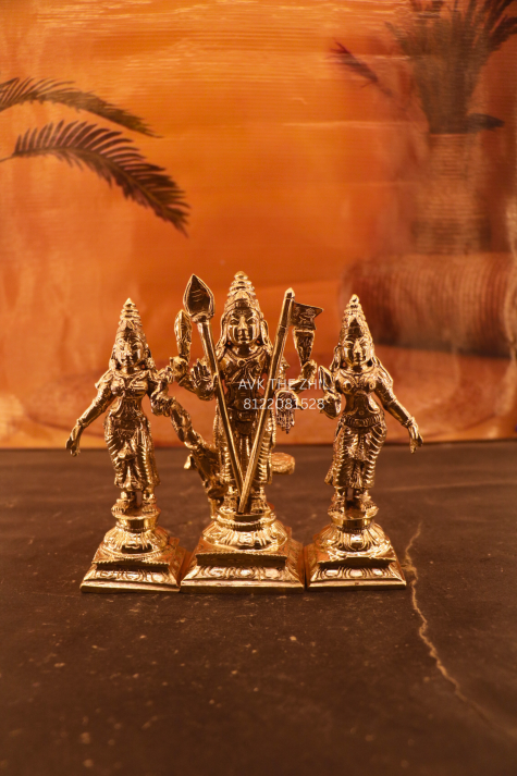 The image showcases an elegant Murugan idol with his divine attendants, beautifully sculpted with intricate detailing and a rich gold polish. The statue reflects traditional South Indian craftsmanship and devotion, making it ideal for pooja rooms, temples, and sacred spaces.