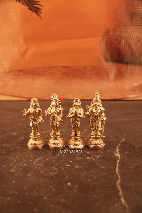 A finely crafted set of miniature brass idols depicting Lord Rama, Goddess Sita, Lord Lakshmana, and Lord Hanuman, designed in traditional South Indian style and ideal for home pooja, temples, and devotional decor.