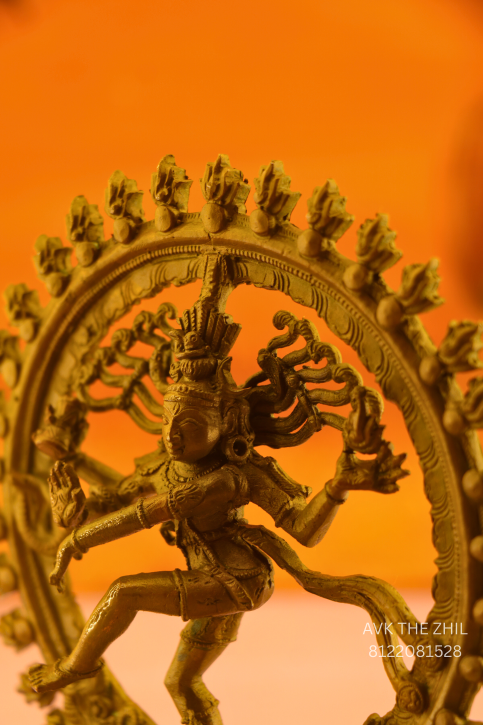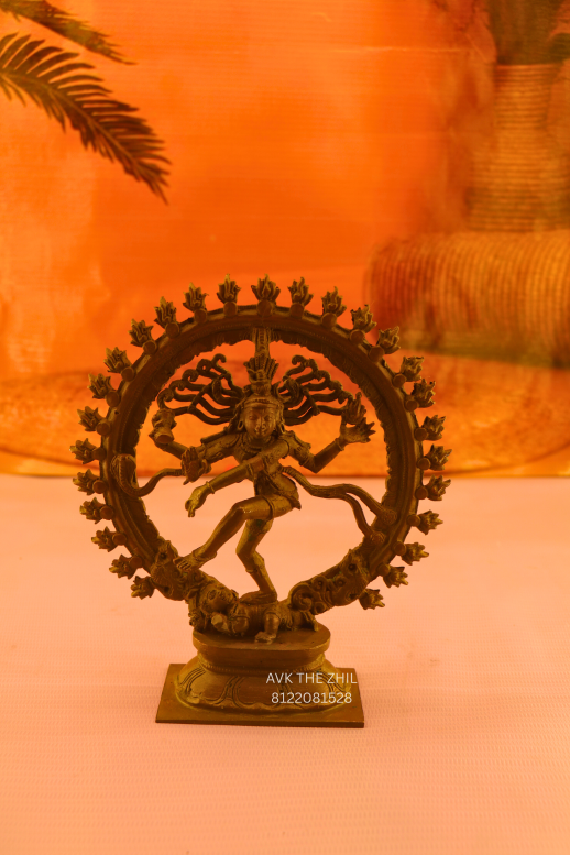 A beautifully detailed Nataraja brass idol, showcasing Lord Shiva in his iconic dancing posture within a circular flame arch. The sculpture reflects exquisite craftsmanship with intricate carvings on the arch, posture, and base. Its antique brass finish adds a timeless devotional appeal. Compact yet elegant, this idol is perfect for daily worship, meditation spaces, offices, or as a sacred gift for special occasions and festivals.