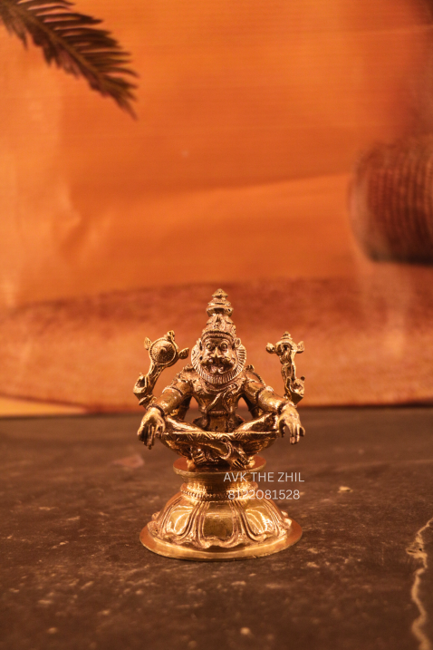 This image showcases a finely crafted Brass Narasimhar Idol, depicting Lord Narasimha—an incarnation of Lord Vishnu—designed with intricate detailing and traditional South Indian craftsmanship. The statue is compact, sturdy, and ideal for worship, decoration, or gifting.