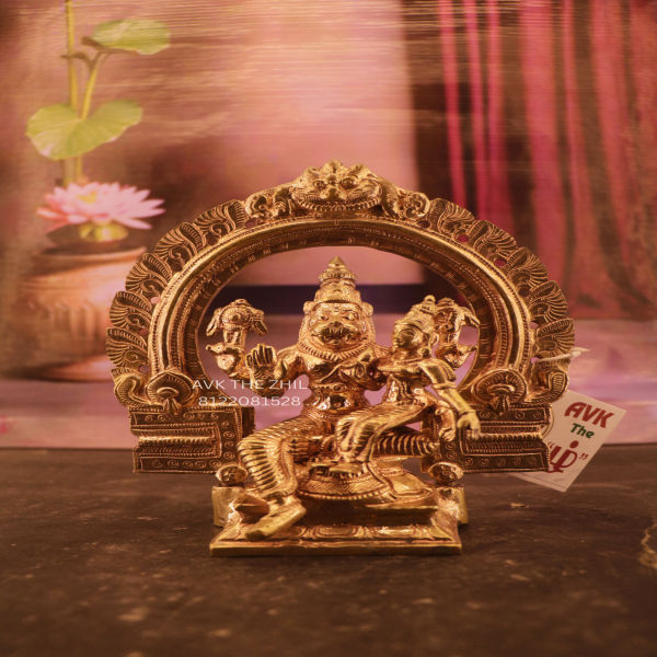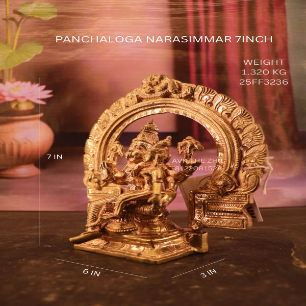 The image shows a beautifully crafted Panchaloga Narasimhar idol placed against a warm, decorative background.