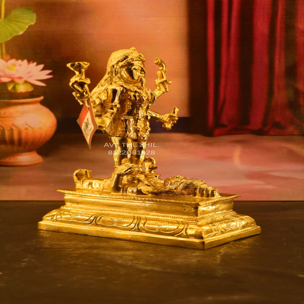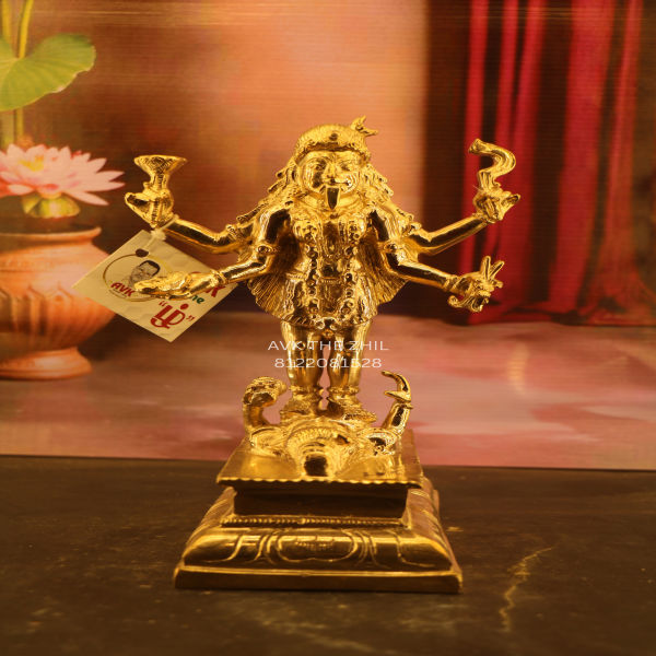 The image displays a beautifully crafted Panchaloga Datchanakaali idol. The statue is golden in color and stands on an ornate rectangular pedestal. The goddess is depicted in a fierce stance, standing atop a demon figure, symbolizing the triumph of divine power over evil. She has multiple arms holding various weapons and objects, each representing divine strength and protection. The background includes a lotus pot on one side and maroon drapery, enhancing the traditional aesthetic.