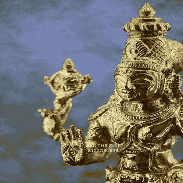 • The image shows a Panchaloga (five-metal alloy) idol of Perumal (Lord Balaji / Venkateswara).