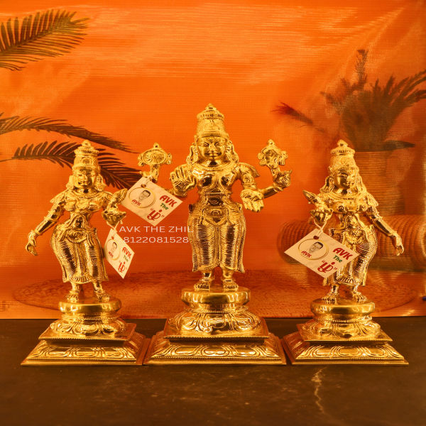 Lord Perumal, the central deity in the set, is the Protector and Preserver of the Universe according to Hindu belief. He stands gracefully holding his divine weapons — the Shankha (conch) and Chakra (discus) — which signify purity and the destruction of evil. His serene expression radiates compassion, while his ornate crown and jewelry represent divine majesty.