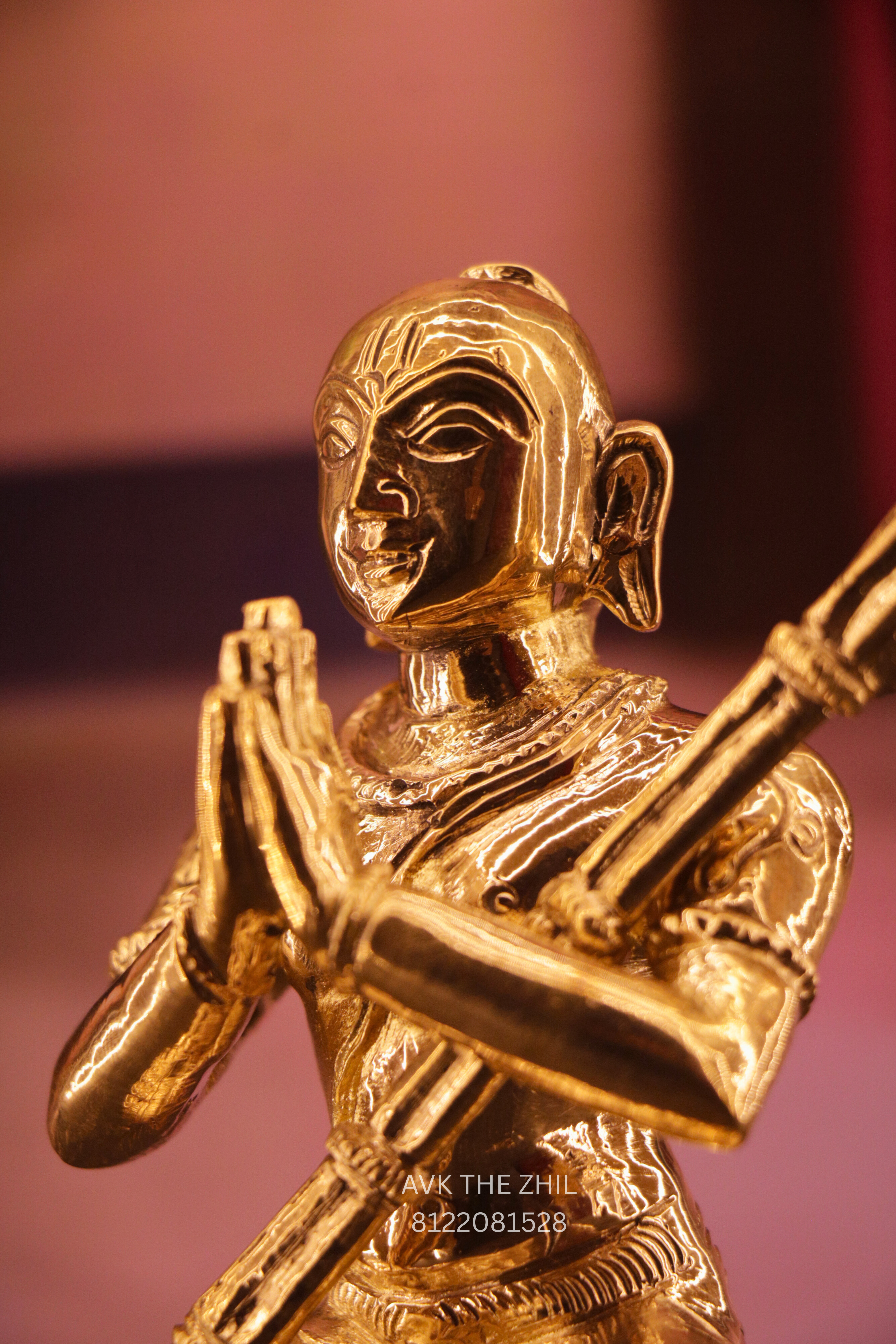 He holds a staff and flag, representing ascetic discipline and the Sri Vaishnava tradition.