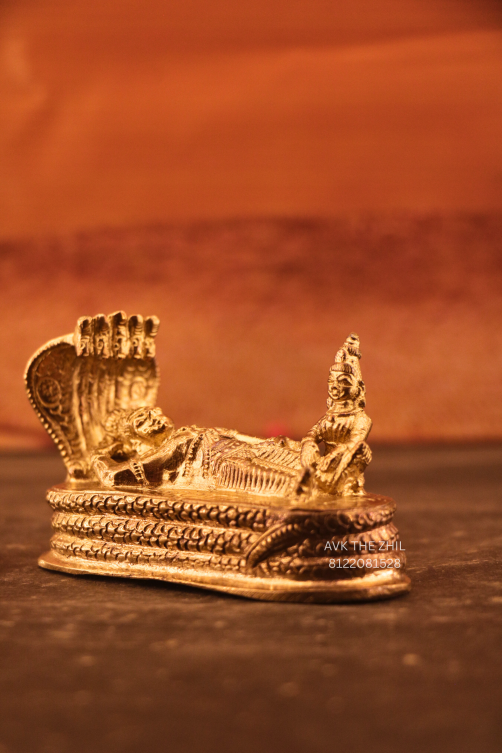 This image shows a finely crafted miniature Ranganadhar (Lord Vishnu reclining on Adi Shesha) idol made of metal with a golden finish. The idol is detailed with precise proportions and is suitable for religious worship, home décor, or gifting purposes.