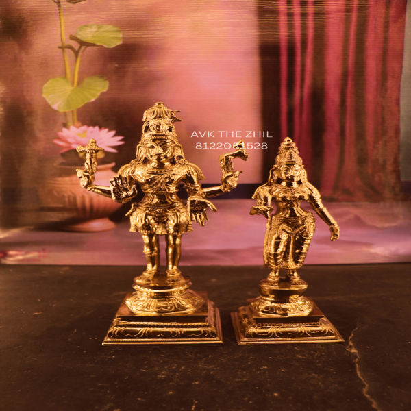 The Shivan Parvathi Set is a beautifully crafted pair of brass idols representing Lord Shiva and Goddess Parvathi, symbolizing divine union, harmony, strength, and prosperity. Each statue stands with intricate detailing, showcasing traditional South Indian artistic style.