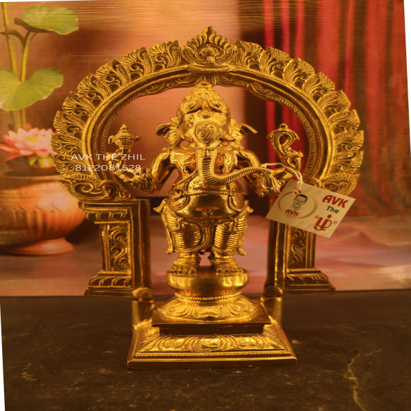 The image shows a beautifully crafted Standing Vinayagar (Lord Ganesha) brass idol that stands 13 inches tall. The idol has intricate carvings and fine detailing, with Vinayagar depicted in a standing posture holding his traditional attributes. The arch behind the idol is artistically designed with ornamental patterns, adding grandeur to the sculpture. The base is broad and stable, measuring 9 inches in length and 4 inches in width. The brass material gives the idol a polished golden shine, symbolizing divinity and prosperity.