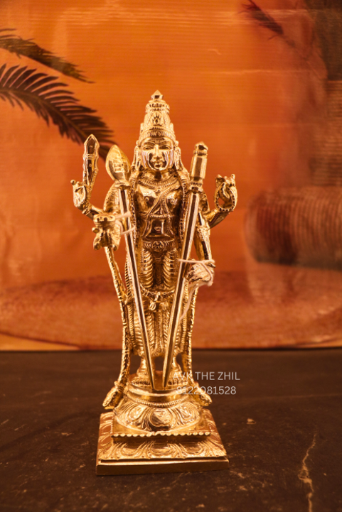 The Thiruchendur Murugan idol is beautifully sculpted with intricate detailing, showcasing Lord Murugan holding the Vel (divine spear), symbolizing wisdom and victory over evil. Made with a polished golden-brass finish, the statue stands 9 inches tall, with a stable 3 x 3 inch base, ensuring durability and elegance.