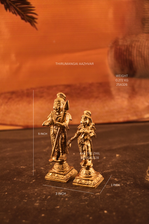 Thirumangai Azhvar Brass Idol Set – A finely crafted traditional brass sculpture depicting Thirumangai Azhvar with his consort, designed for pooja, home altar, and spiritual décor.