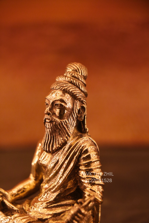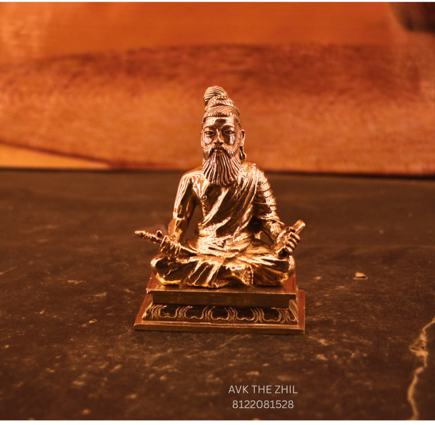 A finely crafted brass idol of Thiruvalluvar, the revered Tamil poet-saint and author of Thirukkural, depicted in a seated posture holding a palm-leaf manuscript, symbolizing wisdom, ethics, and knowledge.