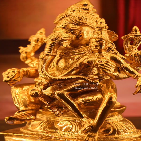 The image showcases a Panchaloha Uchishta Vinayagar idol. The sculpture is golden in color and intricately crafted with fine details. The idol measures 9 inches in height, 6 inches in width, and 4.5 inches in depth, weighing 4.000 kilograms. It is made of Panchaloha (a sacred alloy of five metals).