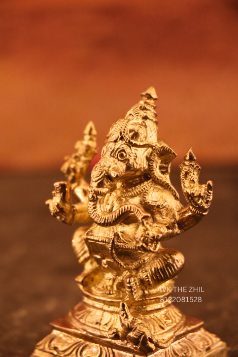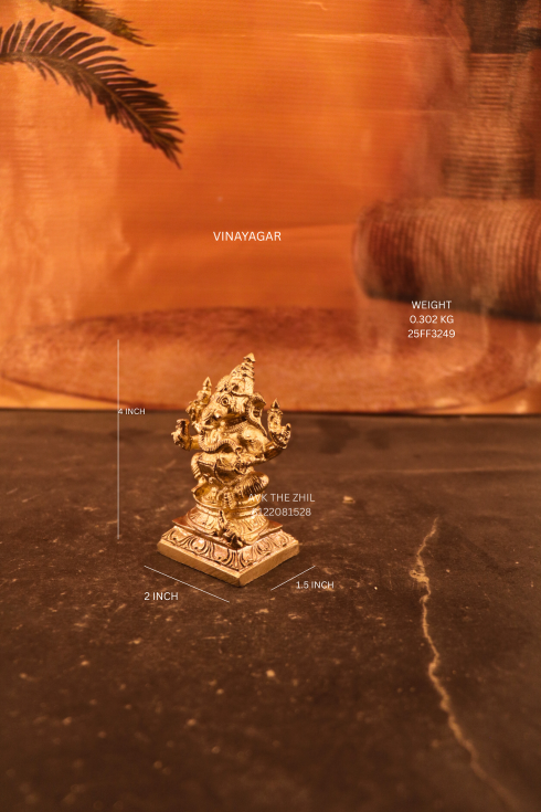 This image features a miniature Vinayagar (Lord Ganesha) idol, finely crafted in a metallic finish, designed for pooja, décor, or gifting purposes. The idol is compact in size, lightweight, and detailed with traditional iconography, making it suitable for home altars, office desks, car dashboards, or spiritual gifting.