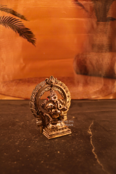 This image shows a brass Vinayagar (Lord Ganesha) idol crafted in a traditional South Indian style, seated under an ornate arch. The idol is compact, finely detailed, and suitable for home pooja, office desks, or gifting purposes.