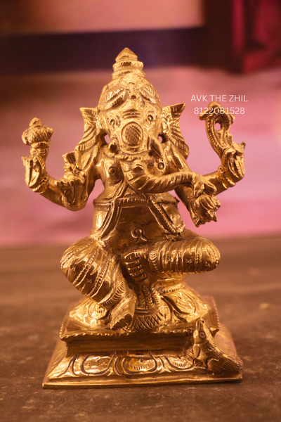 This beautifully crafted 5-inch Vinayagar (Ganesha) statue is made from high-quality brass and features intricate traditional South Indian detailing. The idol depicts Lord Vinayagar seated gracefully, holding symbolic attributes in all four hands, representing wisdom, strength, and prosperity. With its rich golden finish and detailed carvings, this statue is perfect for pooja rooms, home décor, gifting, or spiritual collections.
