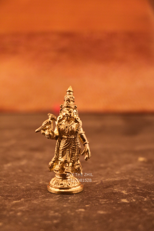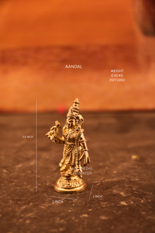 A beautifully crafted Andal Devi miniature idol, made with fine detailing and a polished brass finish. The idol represents Andal in a graceful standing posture, symbolizing devotion and divine love. Its compact size makes it ideal for home altars, pooja rooms, office desks, and gift purposes.