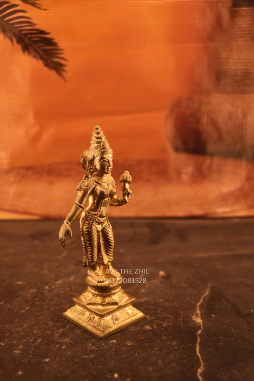 This image shows a handcrafted brass Ambal (Goddess) idol, traditionally made for worship and spiritual décor. The idol represents divine grace and protection and is suitable for home temples, pooja rooms, and gifting purposes.