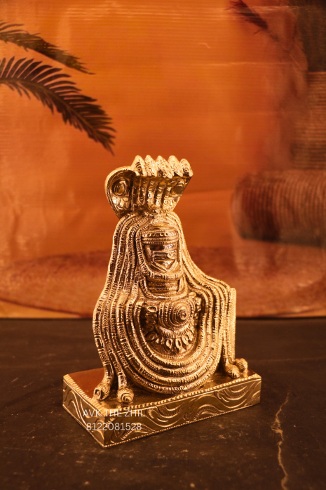 This image features a beautifully crafted Arunachaleswarar idol (8-inch), made with fine metallic detailing and traditional South Indian sculptural artistry. The deity is shown in a powerful yet serene posture, adorned with sacred ornaments and a protective multi-hooded serpent (Naga), representing spiritual awakening and divine protection.