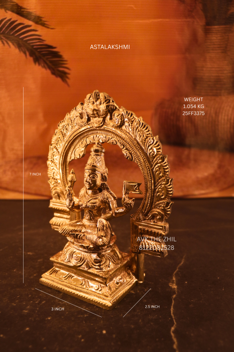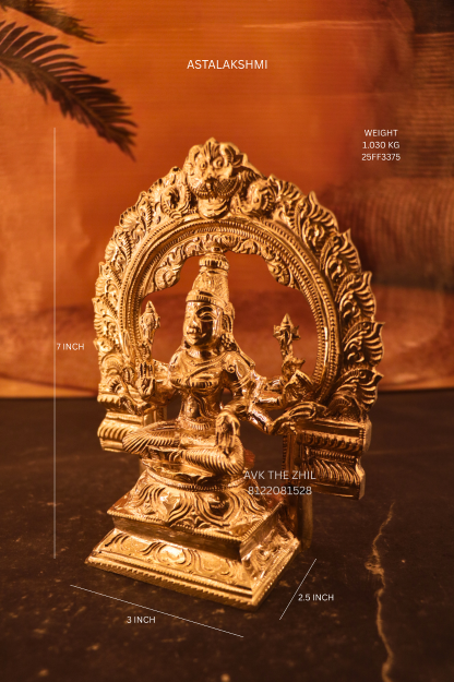 Ashtalakshmi symbolizes the eight kinds of prosperity bestowed by Goddess Lakshmi. These include Adi Lakshmi (primeval wealth), Dhana Lakshmi (financial wealth), Dhanya Lakshmi (abundance of food), Gaja Lakshmi (royalty and power), Santana Lakshmi (children and family prosperity), Veera Lakshmi (courage and strength), Vijaya Lakshmi (success and victory), and Vidya Lakshmi (knowledge and wisdom). Together, the Ashtalakshmi forms represent material, spiritual, and moral prosperity, guiding devotees toward a harmonious and prosperous life.