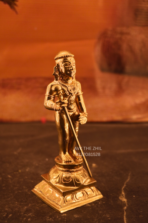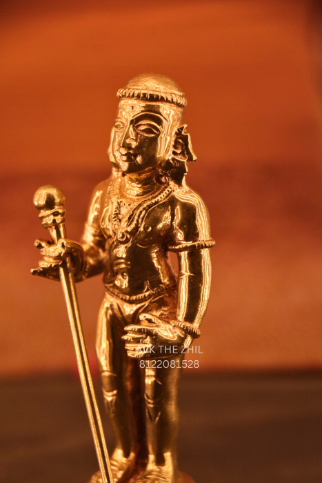 A finely crafted Bala Murugan brass idol, depicting Lord Murugan in a standing posture with a Vel (divine spear), symbolizing wisdom, courage, and divine protection. This compact idol is ideal for home pooja, temples, and spiritual décor.