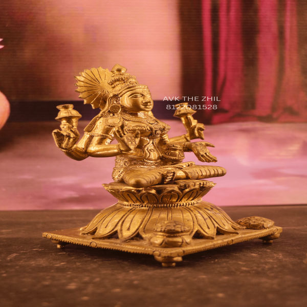 The statue in the image shows a 7-inch brass idol of Dhanalakshmi seated on a beautifully carved lotus pedestal. She is depicted with multiple arms, each holding divine objects symbolising wealth, protection, and blessings. The idol has intricate detailing, with ornaments, crown, and lotus flowers in her hands. The base measures 4 inches, and the weight is shown as 1.900 kg.