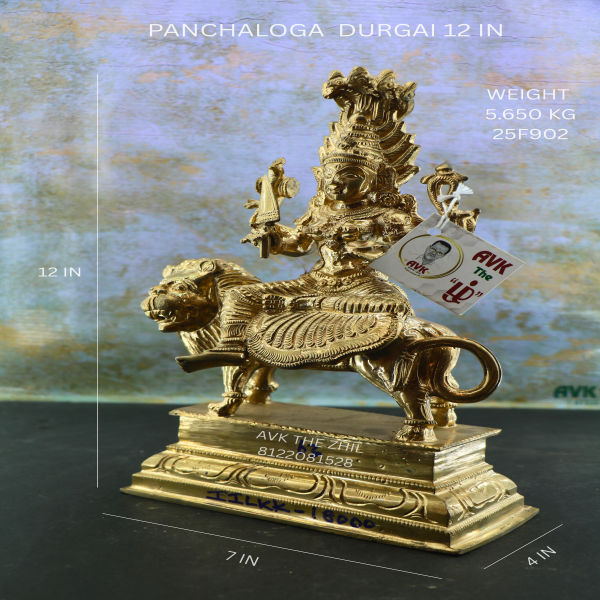 The image shows a Panchaloga idol of Goddess Durgai (Durga) in a seated posture on her divine lion mount. The idol is highly polished with intricate carvings, symbolizing divinity and power. The sculpture is made of Panchaloga (a sacred alloy of five metals traditionally used for making divine idols).