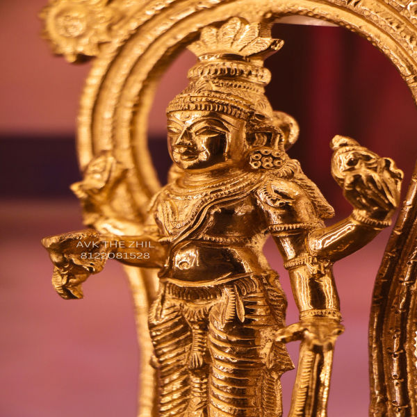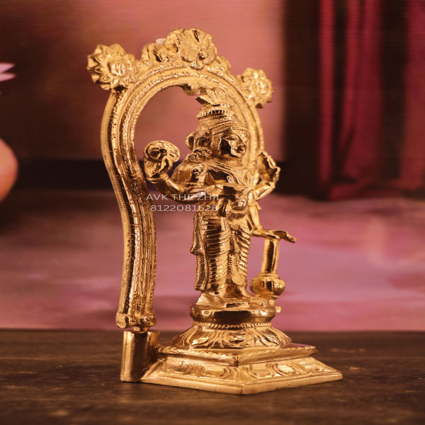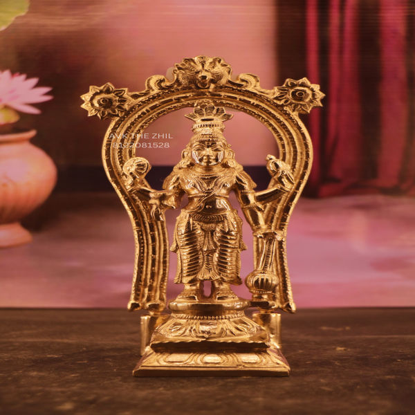 The idol stands on a detailed pedestal and is surrounded by an ornate arch (Prabhavali), enhancing its sacred and artistic value. The finish is golden, giving it a divine and traditional temple-like appearance.