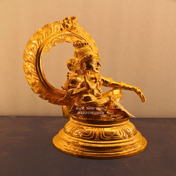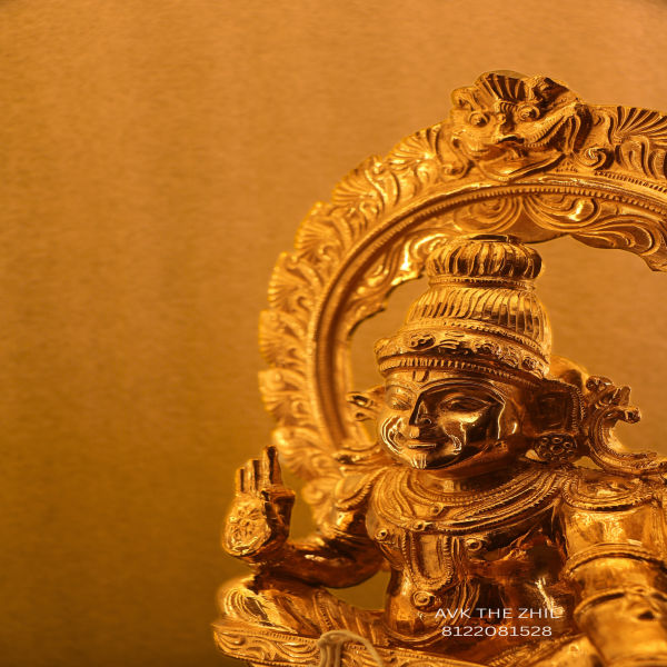 Lord Ayyappan is a symbol of dharma (righteousness), celibacy, and devotion. He is typically depicted in a yogic posture, as shown here, with one leg folded over the other and his hand raised in blessing (abhaya mudra).
