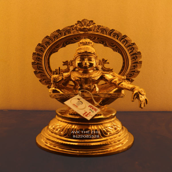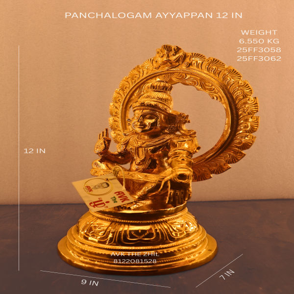 The image showcases a Panchalogam (five-metal alloy) idol of Lord Ayyappan, a revered deity in South India, especially worshipped in Sabarimala, Kerala. The idol is intricately designed and richly polished, exuding a divine and traditional appearance.