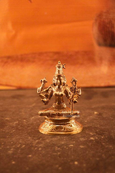 This image shows a finely crafted Kamatchi (Goddess Kamakshi) brass idol, designed with traditional South Indian iconography. The idol is compact, well-balanced, and suitable for home pooja, temple use, or decorative spiritual spaces.